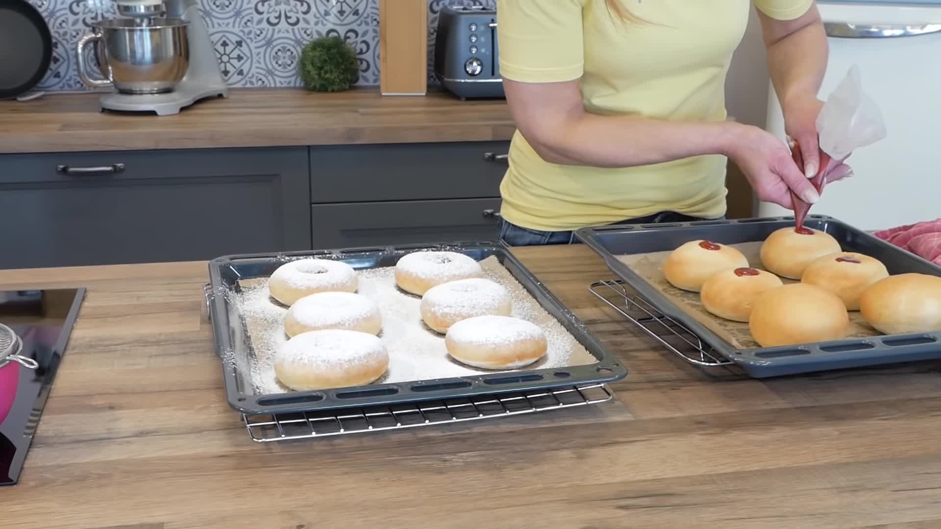 Perfekte Berliner aus dem Backofen, so fluffig weich. Das Ergebnis der Berliner aus dem Backofen kann sich wirklich sehen lassen und mal etwas anders gefüllt sehen sie auch wie große Engelsaugen. (10:05 min)